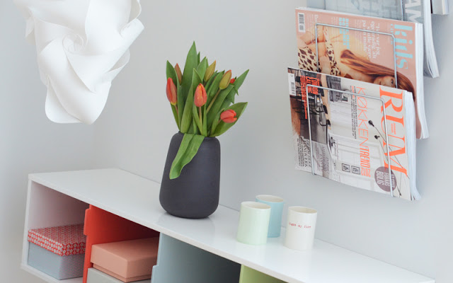 Nå men, egentlig ville jeg også bare vise Ditte Fischer vasen med tulipaner i. Fint, ikke? Og så har to af HAY æskerne, som jeg fik i fødselsdagsgave, også fået plads i den lille reol. Reolen har jeg vist tidligere, men den kan vist godt tåle at blive omtalt igen :) Det er N som har tegnet og snedkereret den og jeg synes at han har gjort det så godt!