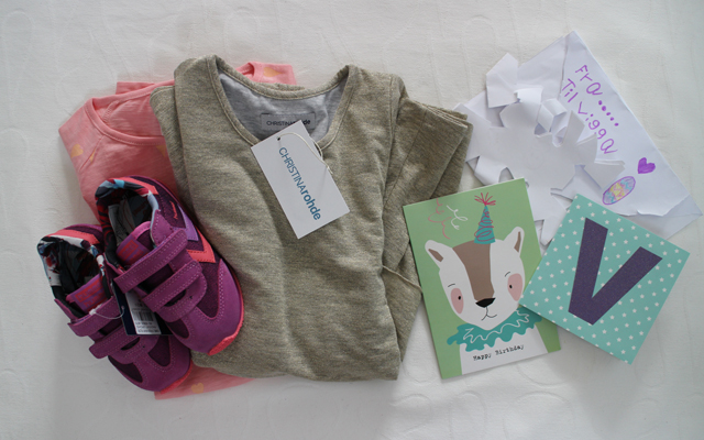Det lyder som nogle helt igennem rare og gode gaver, I havde fundet til hende. Sådan en guldglimmer kjole ku’ også vække begejstring herhjemme, tror jeg.
