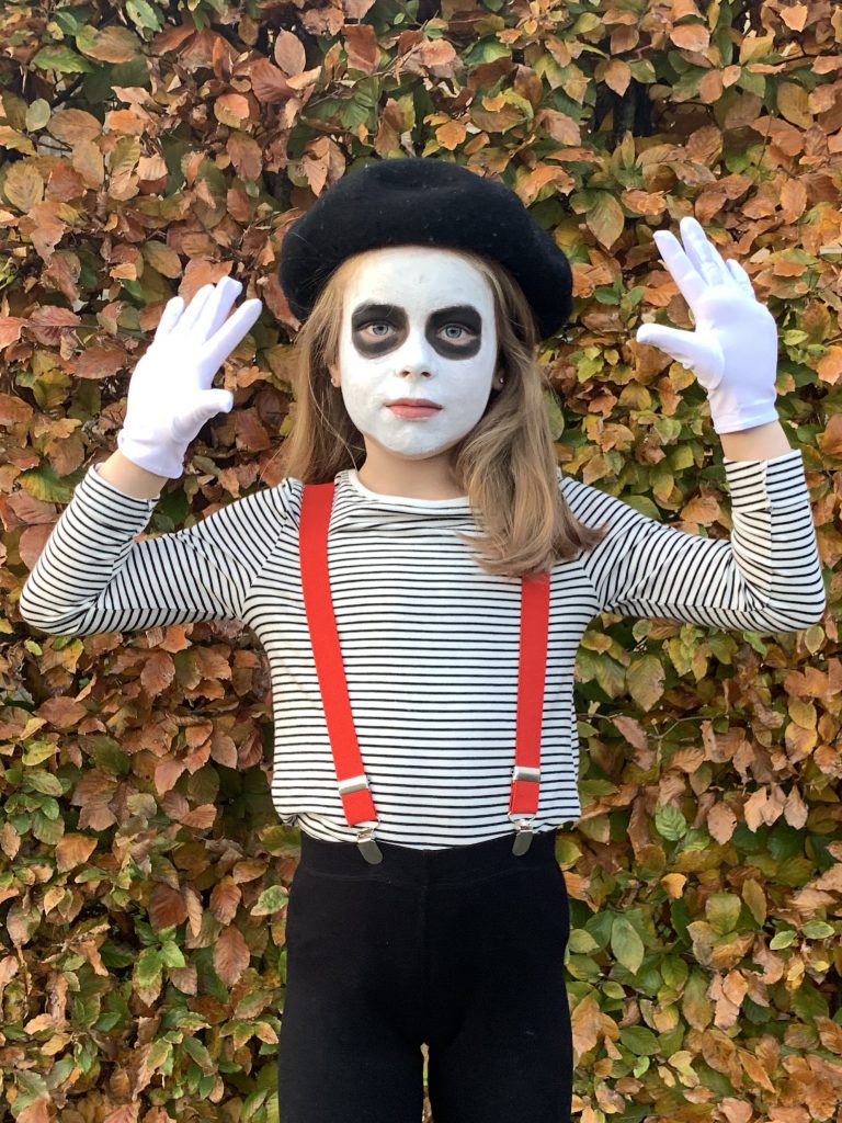 Jeg synes, at det var verdens fineste ide, da Vigga fandt på, at hun ville være Pantomime til Halloween. Vores lille æstetiker. Som hun selv siger, så går hun op i detaljerne. Og hun viste præcis, hvad hun skulle bruge til kostumet: en “kunstnerhat” (som hun havde set i H&M), en stribet bluse, røde seler og små hvide handsker. Og hvid ansigtsmaling – med sort om øjnene, for at tilføre lidt uhygge.